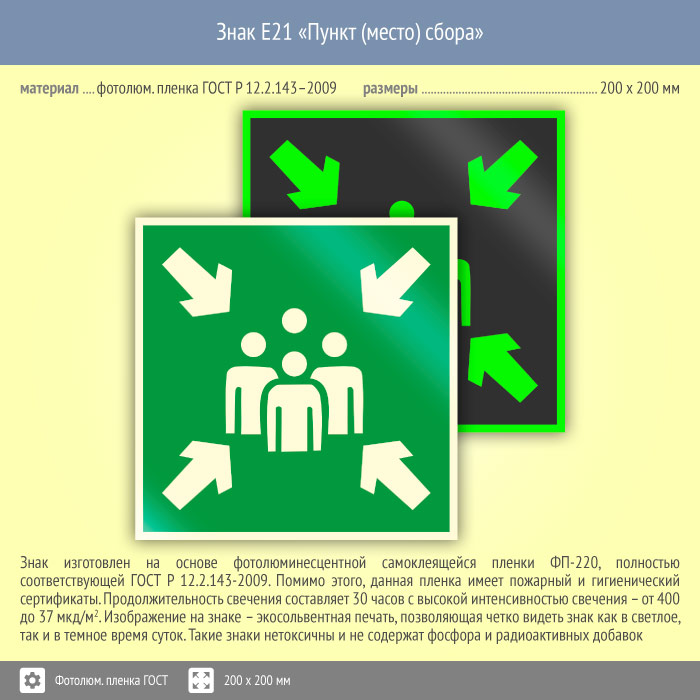 Знак E21 «Пункт (место) сбора» (фотолюминесцентная пленка ГОСТ 34428-2018, 200х200 мм) в Великом Новгороде купить