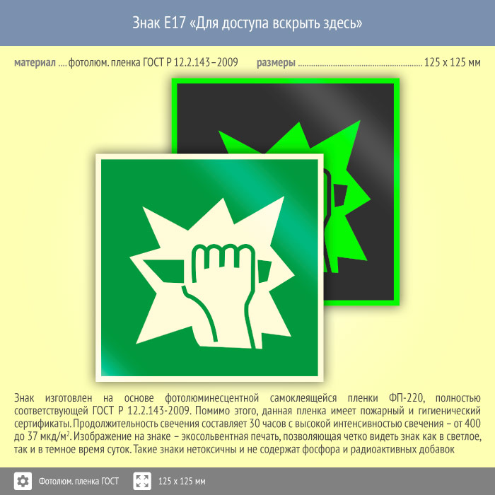 Знак E17 «Для доступа вскрыть здесь» (фотолюминесцентная пленка ГОСТ 34428-2018, 125х125 мм) в Великом Новгороде купить