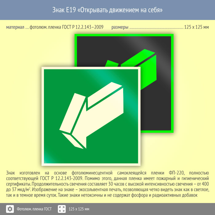 Знак E19 «Открывать движением на себя» (фотолюминесцентная пленка ГОСТ 34428-2018, 125х125 мм) в Великом Новгороде купить