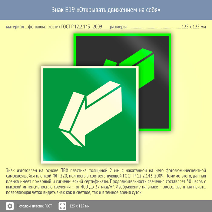 Знак E19 «Открывать движением на себя» (фотолюминесцентный пластик ГОСТ 34428-2018, 125х125 мм) в Великом Новгороде купить