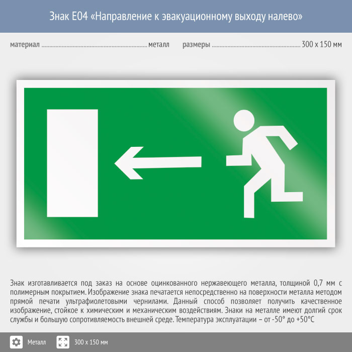Знак E04 «Направление к эвакуационному выходу налево» (металл, 300х150 мм) в Великом Новгороде купить