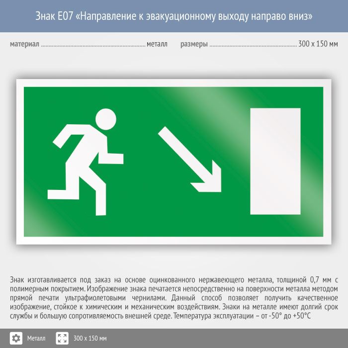 Знак E07 «Направление к эвакуационному выходу направо вниз» (металл, 300х150 мм) в Великом Новгороде купить