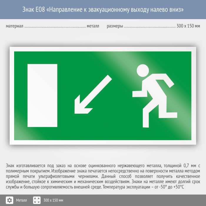 Знак E08 «Направление к эвакуационному выходу налево вниз» (металл, 300х150 мм) в Великом Новгороде купить