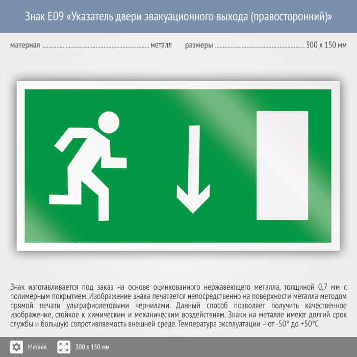 Знак E09 «Указатель двери эвакуационного выхода (правосторонний)» (металл, 300х150 мм) в Великом Новгороде купить