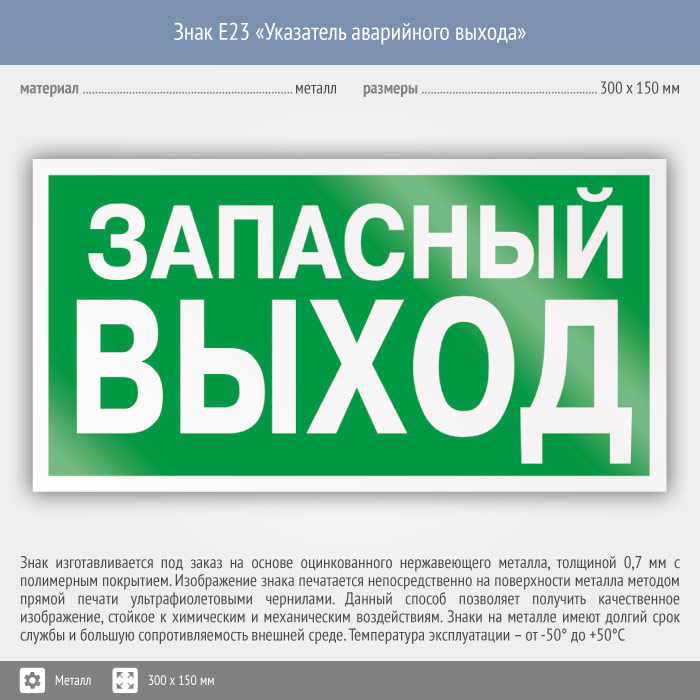 Знак E23 «Указатель запасного выхода» (устаревший) (металл, 300х150 мм) в Великом Новгороде купить