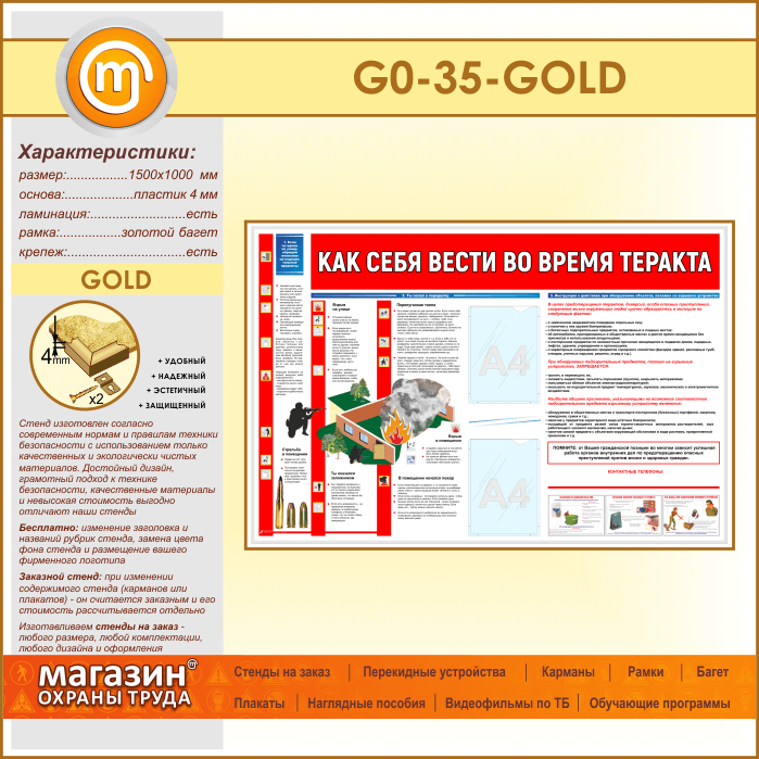 Стенд «Как себя вести во время теракта» c 2 карманами (GO-35-GOLD) в Великом Новгороде купить
