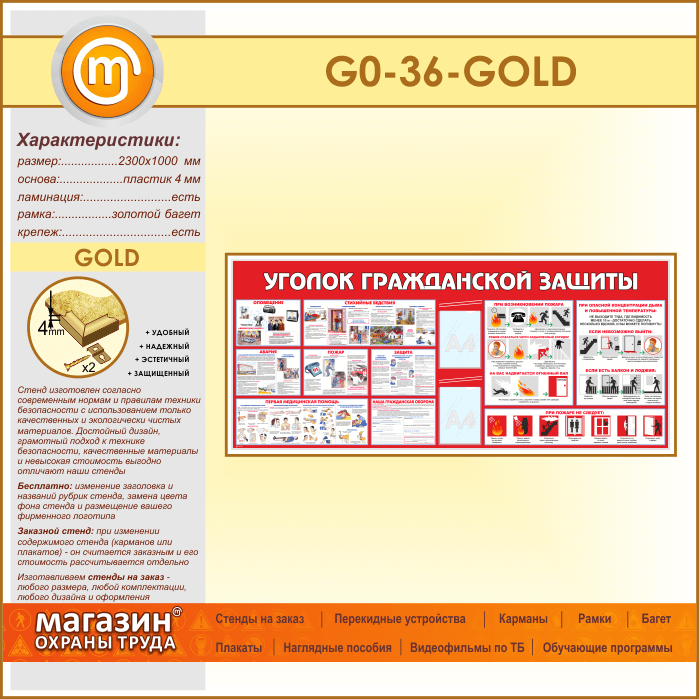 Стенд «Уголок гражданской защиты» c 2 карманами (GO-36-GOLD) в Великом Новгороде купить