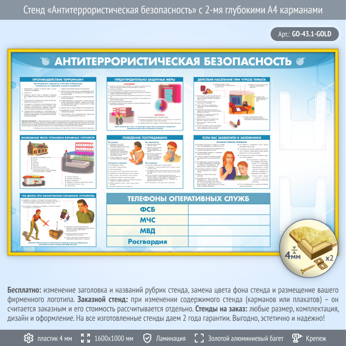 Стенд «Антитеррористическая безопасность» с 2-мя глубокими А4 карманами (GO-43.1-GOLD) в Великом Новгороде купить