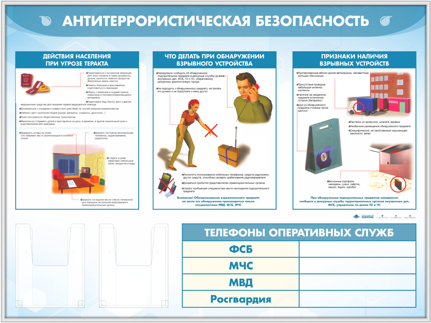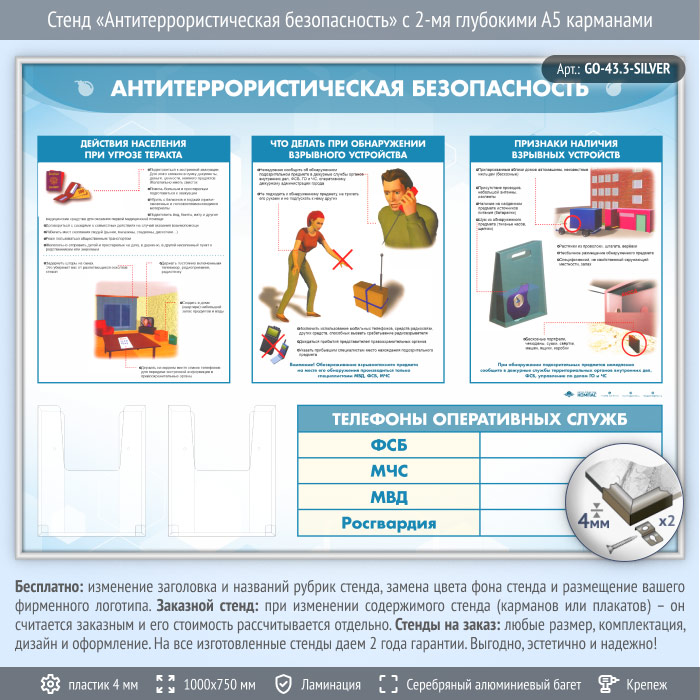Стенд «Антитеррористическая безопасность» с 2-мя глубокими А5 карманами (GO-43.3-SILVER) в Великом Новгороде купить