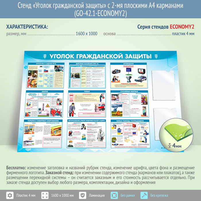 Стенд «Уголок гражданской защиты» с 2-мя плоскими А4 карманами (GO-42.1-ECONOMY2) в Великом Новгороде купить