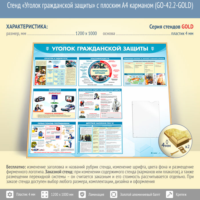Стенд «Уголок гражданской защиты» с плоским А4 карманом (GO-42.2-GOLD) в Великом Новгороде купить