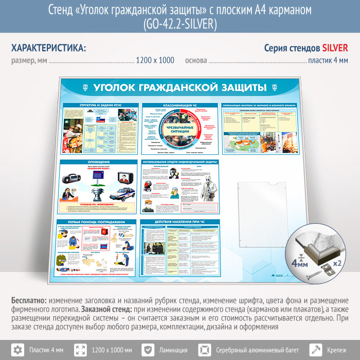 Стенд «Уголок гражданской защиты» с плоским А4 карманом (GO-42.2-SILVER) в Великом Новгороде купить