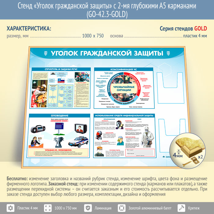 Стенд «Уголок гражданской защиты» с 2-мя глубокими А5 карманами (GO-42.3-GOLD) в Великом Новгороде купить