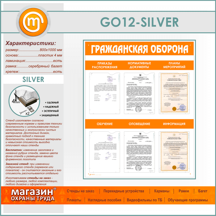 Стенд «Гражданская оборона» с 6 плоскими карманами (GO-12-SILVER) в Великом Новгороде купить