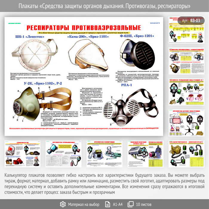 Плакаты «Средства защиты органов дыхания. Противогазы, респираторы» (ВЗ-03, 10 листов) в Великом Новгороде купить