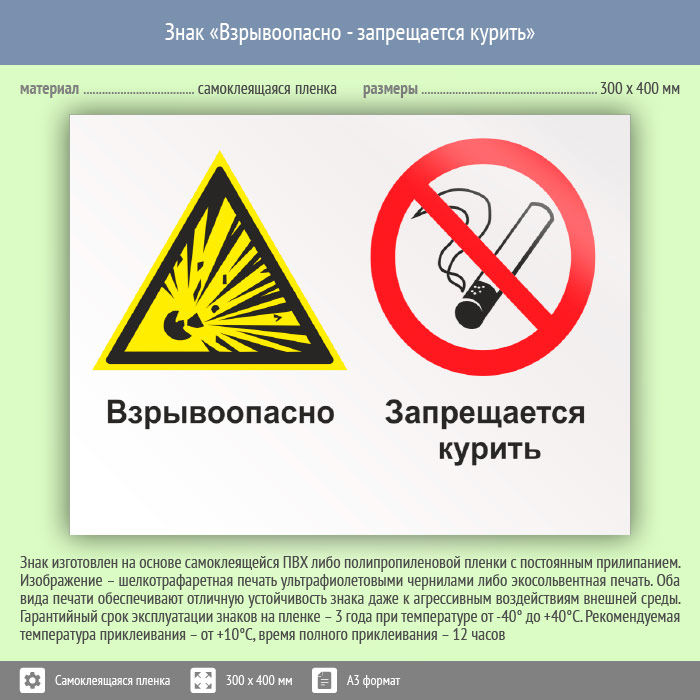 Знак «Взрывоопасно - запрещается курить», КЗ-06 (пленка, 400х300 мм) в Великом Новгороде купить