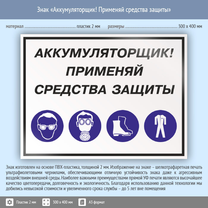 Знак «Аккумуляторщик! Применяй средства защиты», КЗ-02 (пластик, 400х300 мм) в Великом Новгороде купить