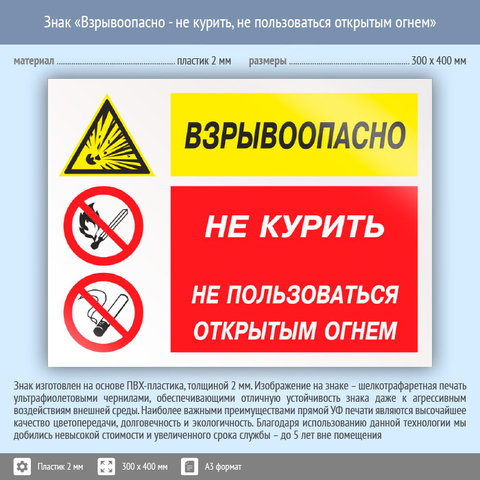 Знак «Взрывоопасно - не курить, не пользоваться открытым огнем», КЗ-05 (пластик, 400х300 мм) в Великом Новгороде купить
