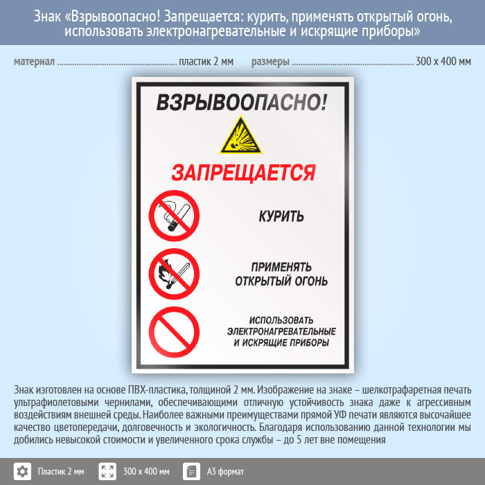 Знак «Взрывоопасно! Запрещается: курить, применять открытый огонь, использовать электронагревательные и искрящие приборы», КЗ-10 (пластик, 300х400 мм) в Великом Новгороде купить