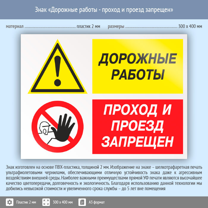 Знак «Дорожные работы - проход и проезд запрещен», КЗ-20 (пластик, 400х300 мм) в Великом Новгороде купить
