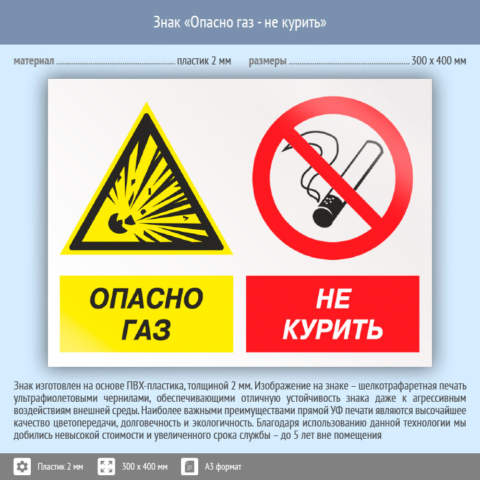 Знак «Опасно газ - не курить», КЗ-44 (пластик, 400х300 мм) в Великом Новгороде купить