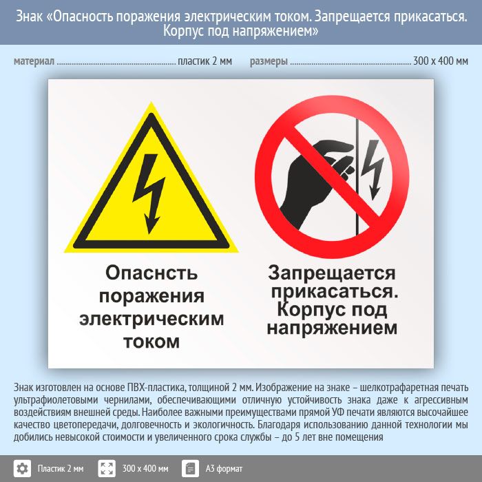 Знак «Опасность поражения электрическим током. Запрещается прикасаться. Корпус под напряжением», КЗ-47 (пластик, 400х300 мм) в Великом Новгороде купить
