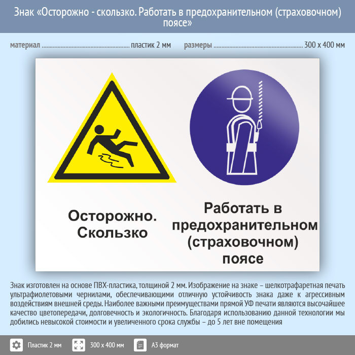 Знак «Осторожно - скользко. Работать в предохранительном (страховочном) поясе», КЗ-58 (пластик, 400х300 мм) в Великом Новгороде купить