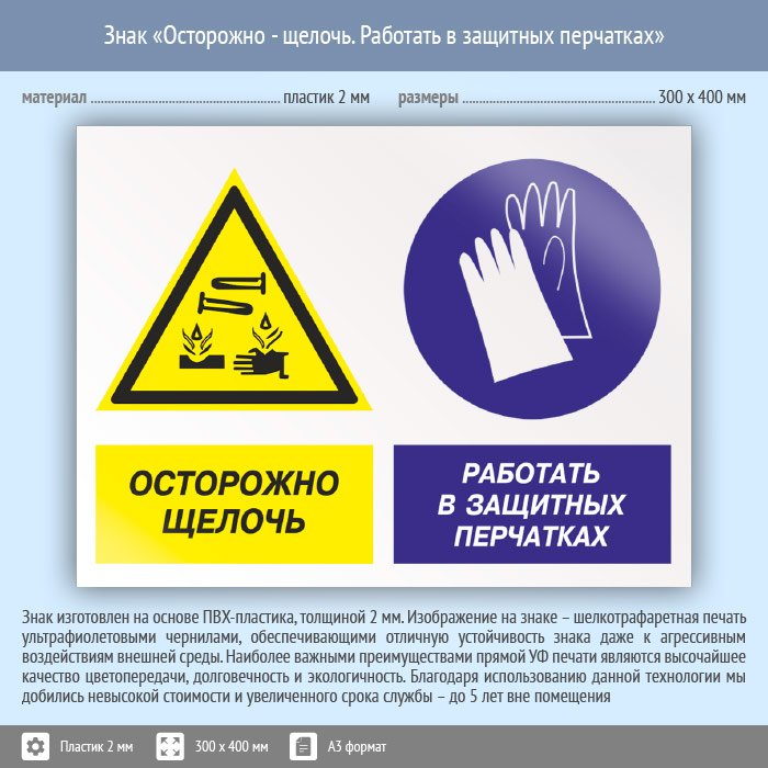 Знак «Осторожно - щелочь. Работать в защитных перчатках», КЗ-60 (пластик, 400х300 мм) в Великом Новгороде купить