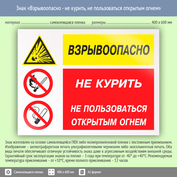 Знак «Взрывоопасно - не курить, не пользоваться открытым огнем», КЗ-05 (пленка, 600х400 мм) в Великом Новгороде купить