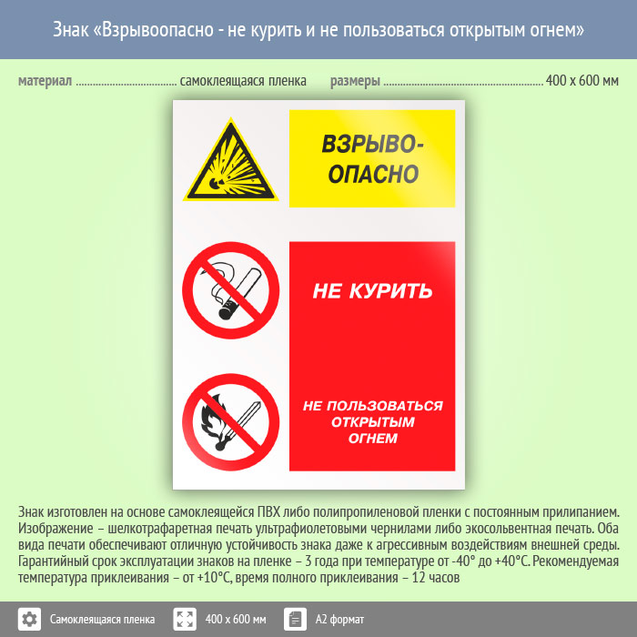 Знак «Взрывоопасно - не курить и не пользоваться открытым огнем», КЗ-08 (пленка, 400х600 мм) в Великом Новгороде купить