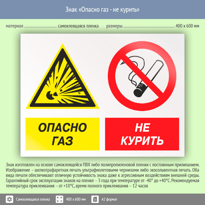 Знак «Опасно газ - не курить», КЗ-44 (пленка, 600х400 мм) в Великом Новгороде купить