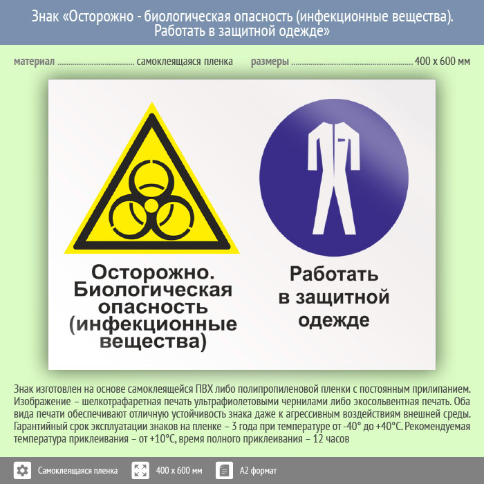 Знак «Осторожно - биологическая опасность (инфекционные вещества). Работать в защитной одежде», КЗ-53 (пленка, 600х400 мм) в Великом Новгороде купить