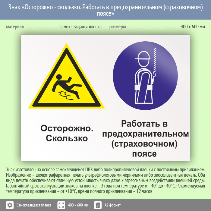 Знак «Осторожно - скользко. Работать в предохранительном (страховочном) поясе», КЗ-58 (пленка, 600х400 мм) в Великом Новгороде купить