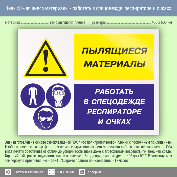Знак «Пылящиеся материалы - работать в спецодежде, респираторе и очках», КЗ-79 (пленка, 600х400 мм) в Великом Новгороде купить