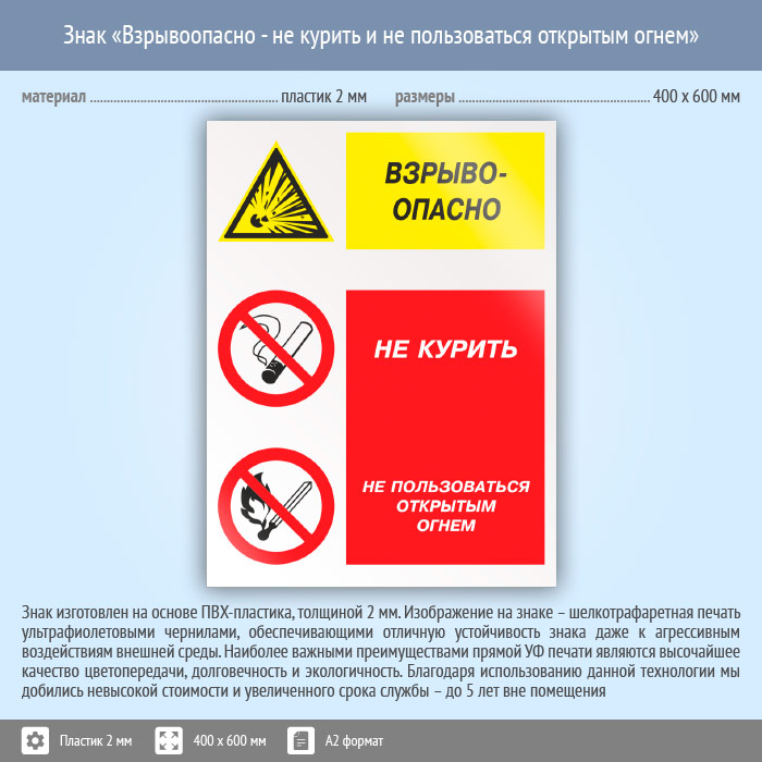 Знак «Взрывоопасно - не курить и не пользоваться открытым огнем», КЗ-08 (пластик, 400х600 мм) в Великом Новгороде купить