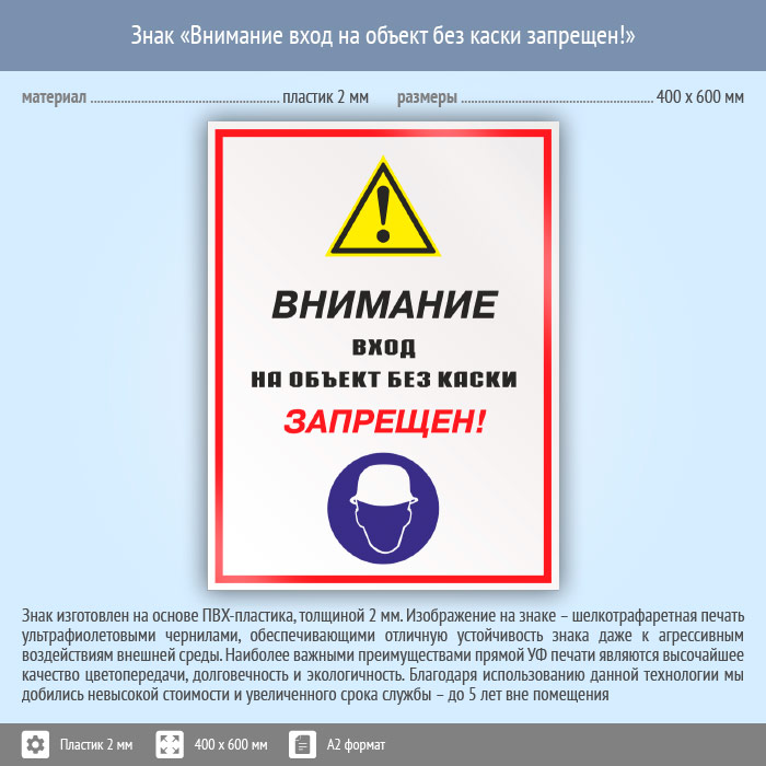 Знак «Внимание вход на объект без каски запрещен!», КЗ-13 (пластик, 400х600 мм) в Великом Новгороде купить