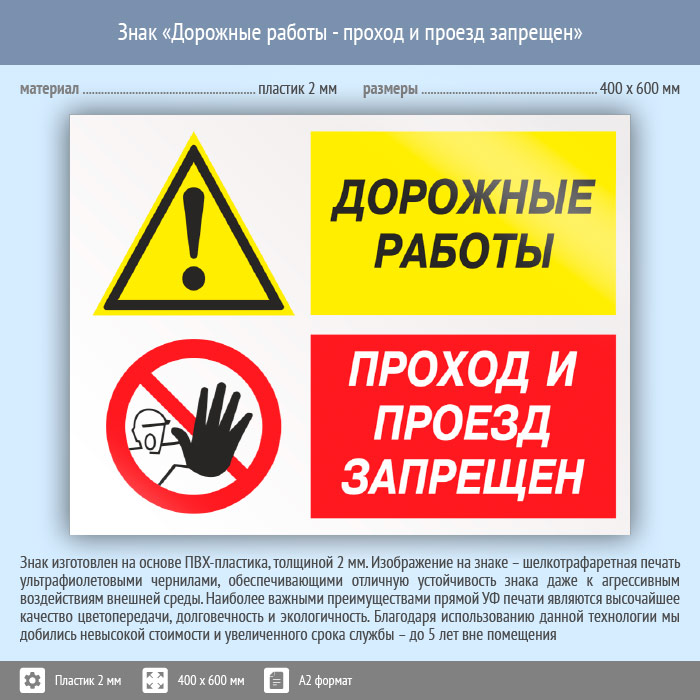 Знак «Дорожные работы - проход и проезд запрещен», КЗ-20 (пластик, 600х400 мм) в Великом Новгороде купить