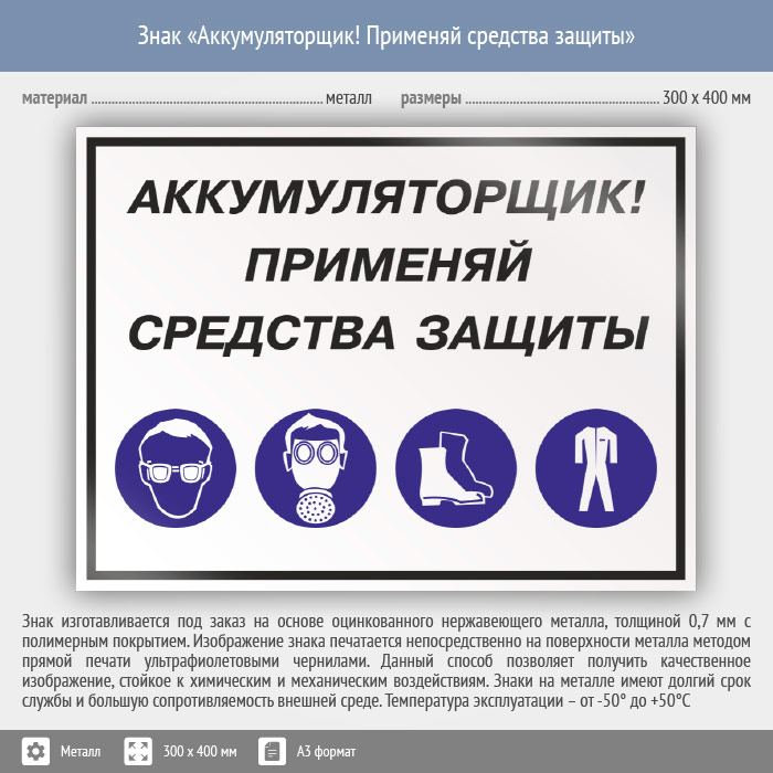 Знак «Аккумуляторщик! Применяй средства защиты», КЗ-02 (металл, 400х300 мм) в Великом Новгороде купить