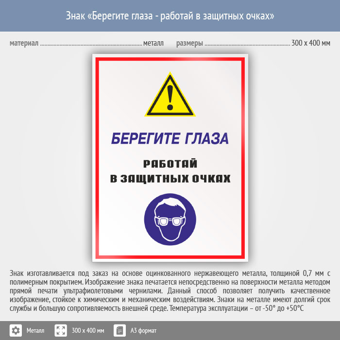 Знак «Берегите глаза - работай в защитных очках», КЗ-04 (металл, 300х400 мм) в Великом Новгороде купить