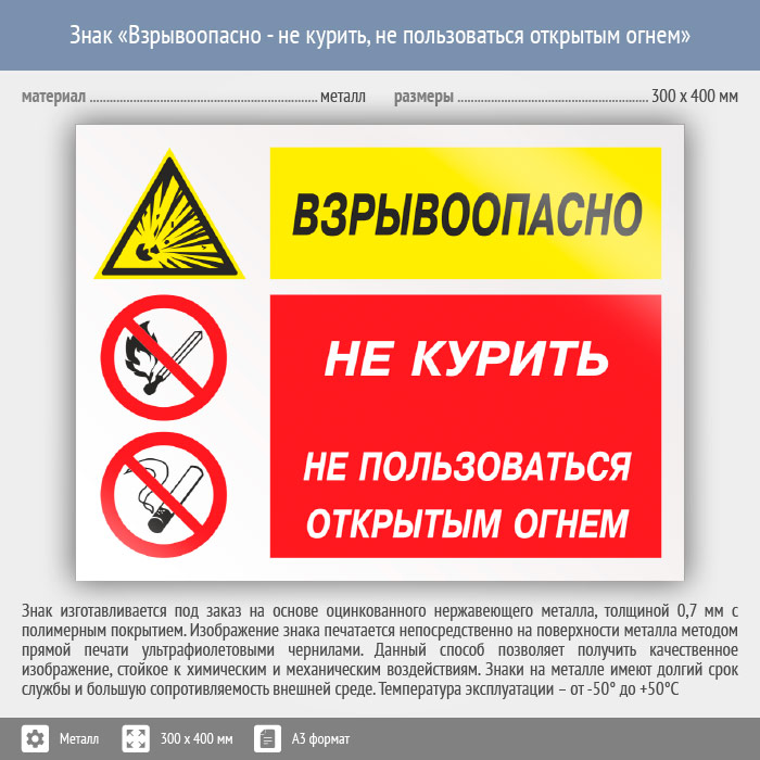 Знак «Взрывоопасно - не курить, не пользоваться открытым огнем», КЗ-05 (металл, 400х300 мм) в Великом Новгороде купить