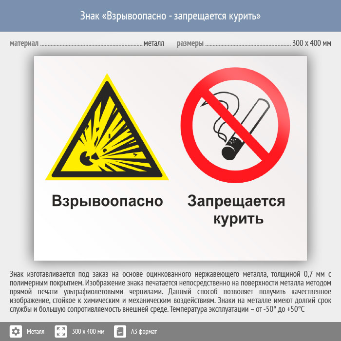 Знак «Взрывоопасно - запрещается курить», КЗ-06 (металл, 400х300 мм) в Великом Новгороде купить