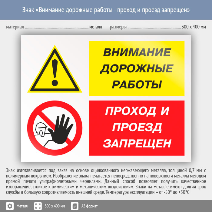 Знак «Внимание дорожные работы - проход и проезд запрещен», КЗ-14 (металл, 400х300 мм) в Великом Новгороде купить