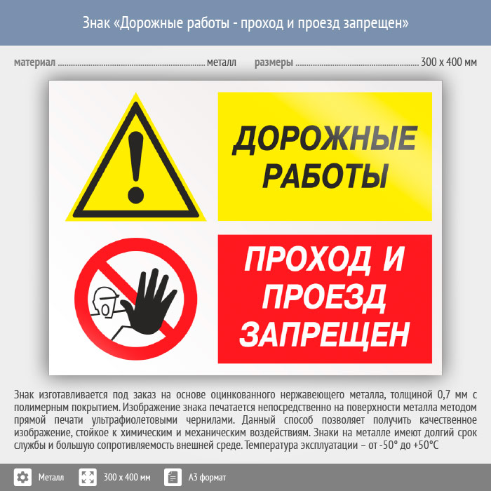 Знак «Дорожные работы - проход и проезд запрещен», КЗ-20 (металл, 400х300 мм) в Великом Новгороде купить