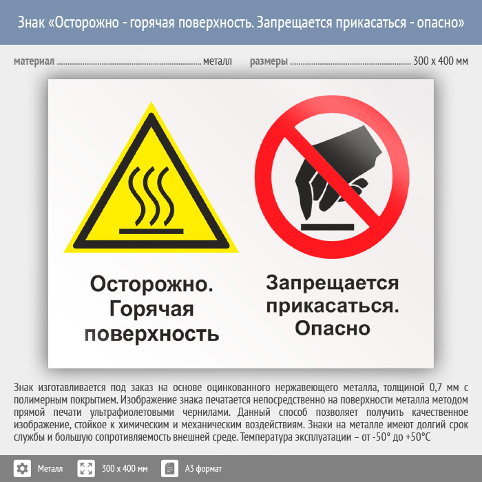 Знак «Осторожно - горячая поверхность. Запрещается прикасаться - опасно», КЗ-54 (металл, 400х300 мм) в Великом Новгороде купить