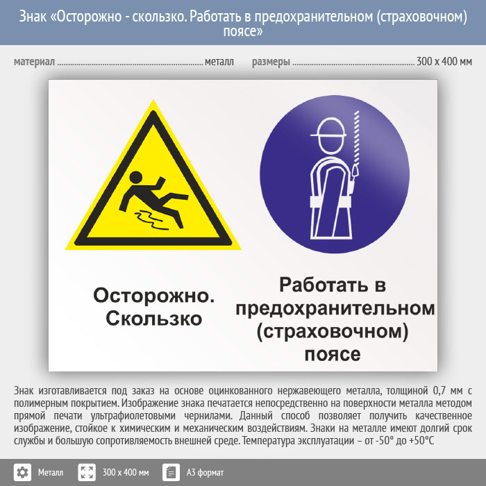 Знак «Осторожно - скользко. Работать в предохранительном (страховочном) поясе», КЗ-58 (металл, 400х300 мм) в Великом Новгороде купить