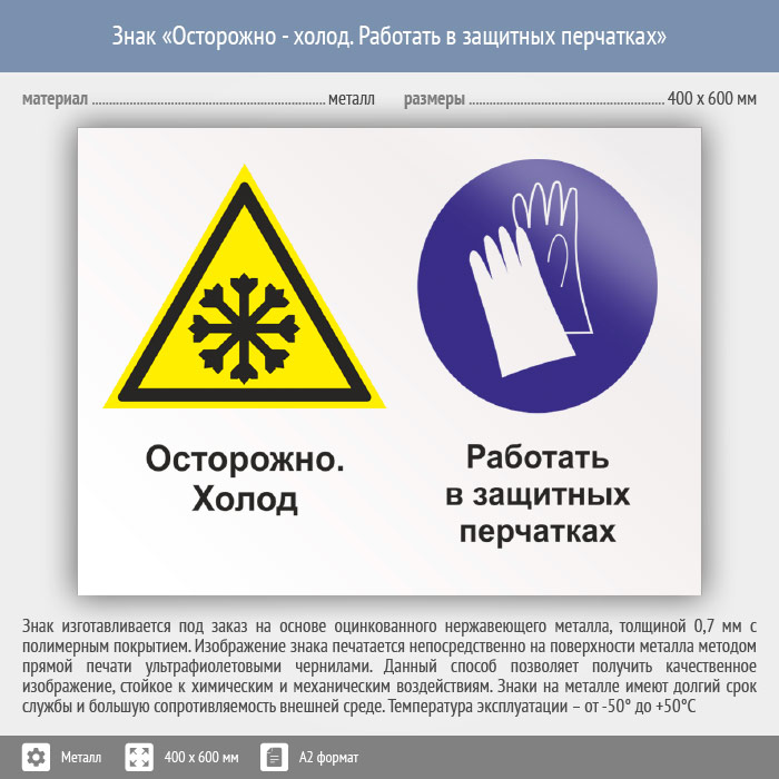 Знак «Осторожно - холод. Работать в защитных перчатках», КЗ-59 (металл, 600х400 мм) в Великом Новгороде купить