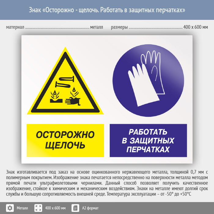 Знак «Осторожно - щелочь. Работать в защитных перчатках», КЗ-60 (металл, 600х400 мм) в Великом Новгороде купить