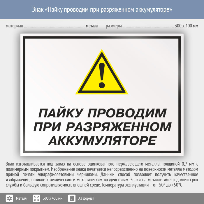 Знак «Пайку проводим при разряженном аккумуляторе», КЗ-62 (металл, 400х300 мм) в Великом Новгороде купить