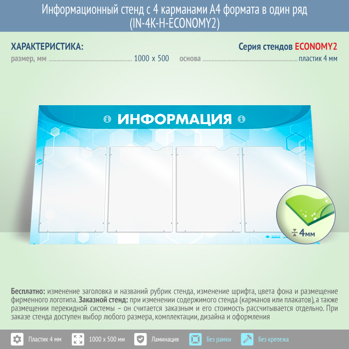 Информационный стенд с 4 карманами А4 формата в один ряд (IN-4K-H-ECONOMY2) в Великом Новгороде купить
