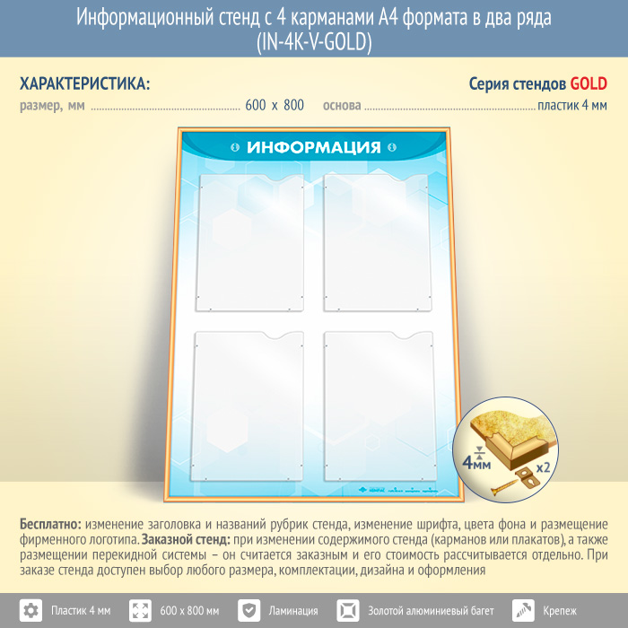 Информационный стенд с 4 карманами А4 формата в два ряда (IN-4K-V-GOLD) в Великом Новгороде купить